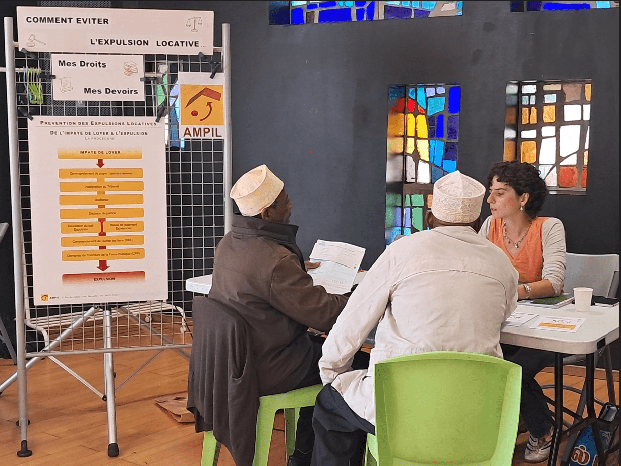 Action historique de l’AMPIL mise en place en réponse à la loi de lutte contre les exclusions de 1998, l’équipe Habitat, accompagné d’un avocat, accueille les Marseillais en situation d’expulsion à tout moment de la procédure, c’est à dire du premier euro d’impayé jusqu’au concours de la force publique. A l’issue de ce premier accueil, la famille peut être prise en charge par l’avocat de la permanence et elle peut bénéficier d’un accompagnement social adapté mené par le travailleur social de l’équipe de l’AMPIL.